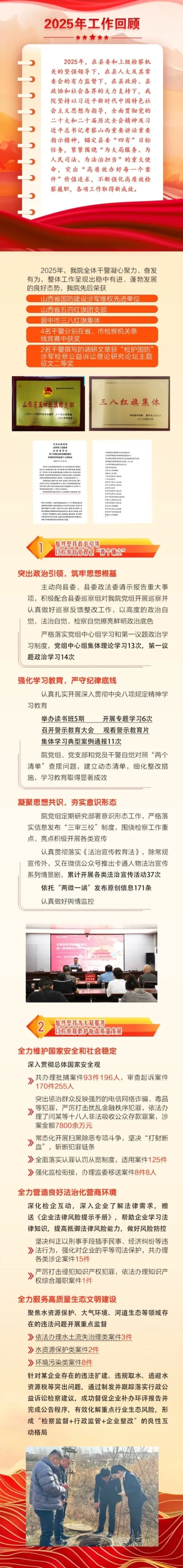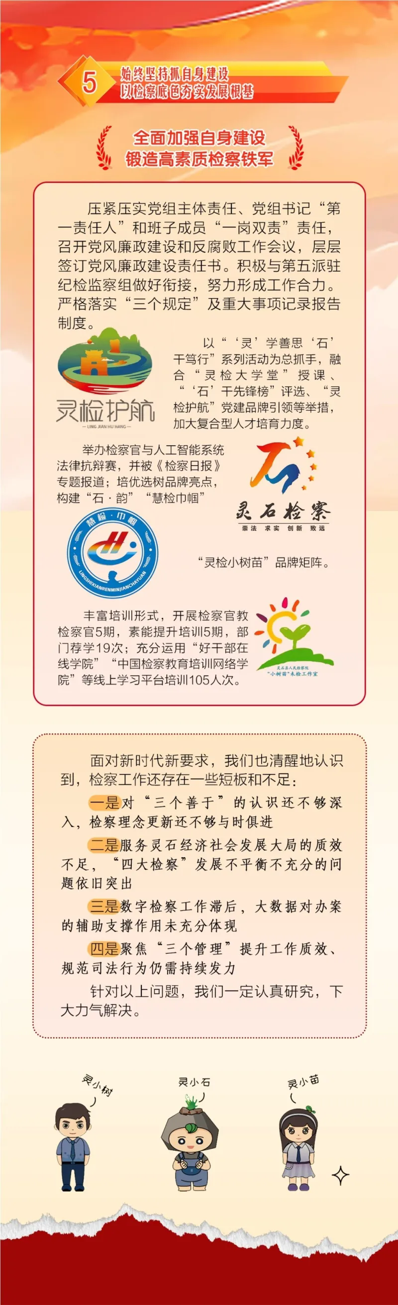 以“灵检护航”党建品牌为抓手,推动党建与业务深度融合。深化巡察整改成果运用,把党的政治优势转化为推动检察工作的优势。建强队伍,培育检察精英人才。持续落实“三不腐”机制,以自身净确保自身硬。持之以恒正风肃纪,永葆“永远在路上”的清醒和韧劲。